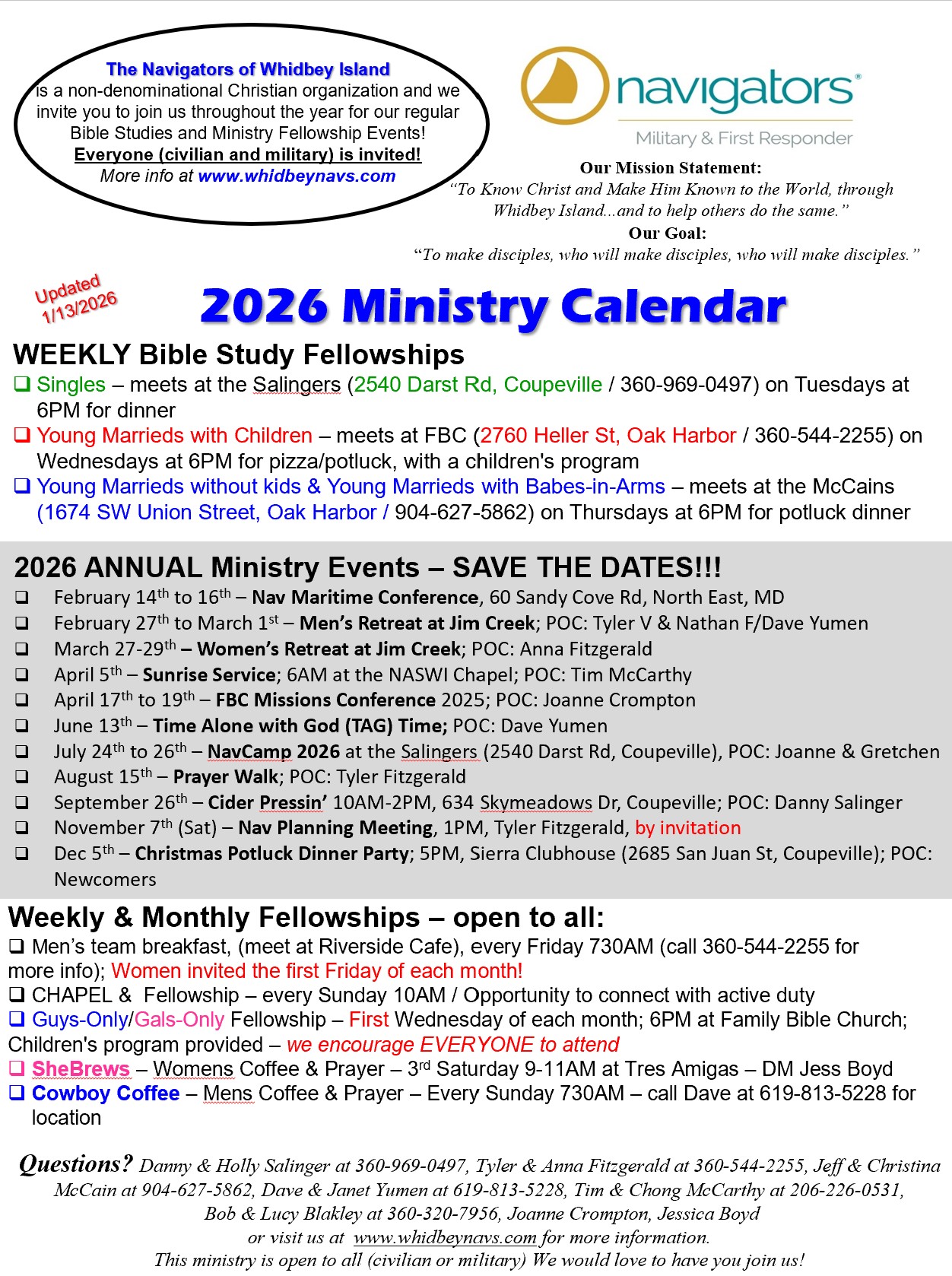 Questions? Danny & Holly Salinger at 360-969-0497, Tyler & Anna Fitzgerald at 360-544-2255, Jeff & Christina McCain at 904-627-5862, Dave & Janet Yumen at 619-813-5228, Tim & Chong McCarthy at 206-226-0531, Bob & Lucy Blakley at 360-320-7956,